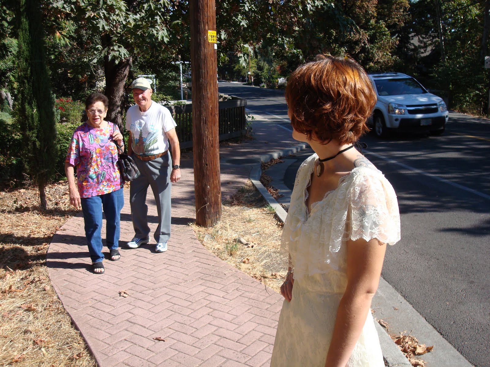 The B. Siegal Co dress that I bought today (for $3.99! HA!) is clearly well made. It has a calf-length skirt with built-in crinoline, front pockets, buttons down the back, a sash, and long zippered sleeves. The sash actually buttons onto the dress in back!